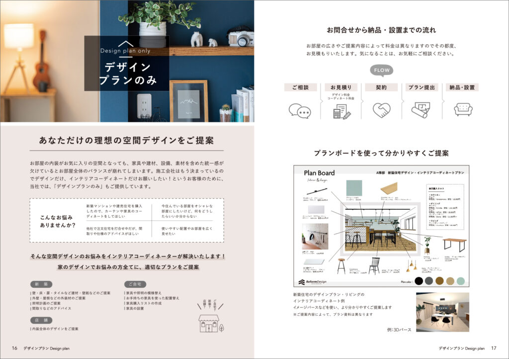 フォームデザイン様は、リフォームを中心に「インテリアコーディネート」「リノベーション事業」をおこなっています。今回は事業内容をまとめた、「リノベーションブック」の制作を行いました。地域密着で女性を中心とした会社であり、ナチュラルなイメージでの制作となりました。