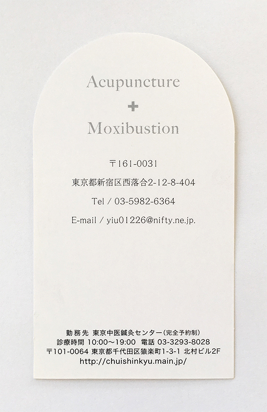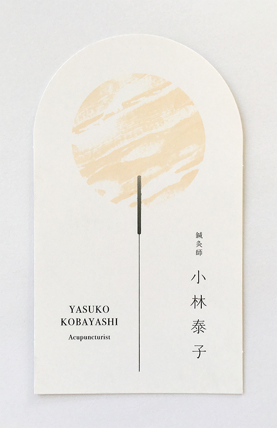 個人/DESIGN 鍼灸師名刺 デザイン/DESIGN client:小林泰子(鍼灸師) 鍼灸師・小林泰子さんの名刺を制作いたしました。針を箔押しにし、艾(もぐさ)のカタチに合わせて型抜きにしました。紙は硬質でサラッとした肌触りのものを選び清潔感を演出しました。 <事例紹介一覧を見る