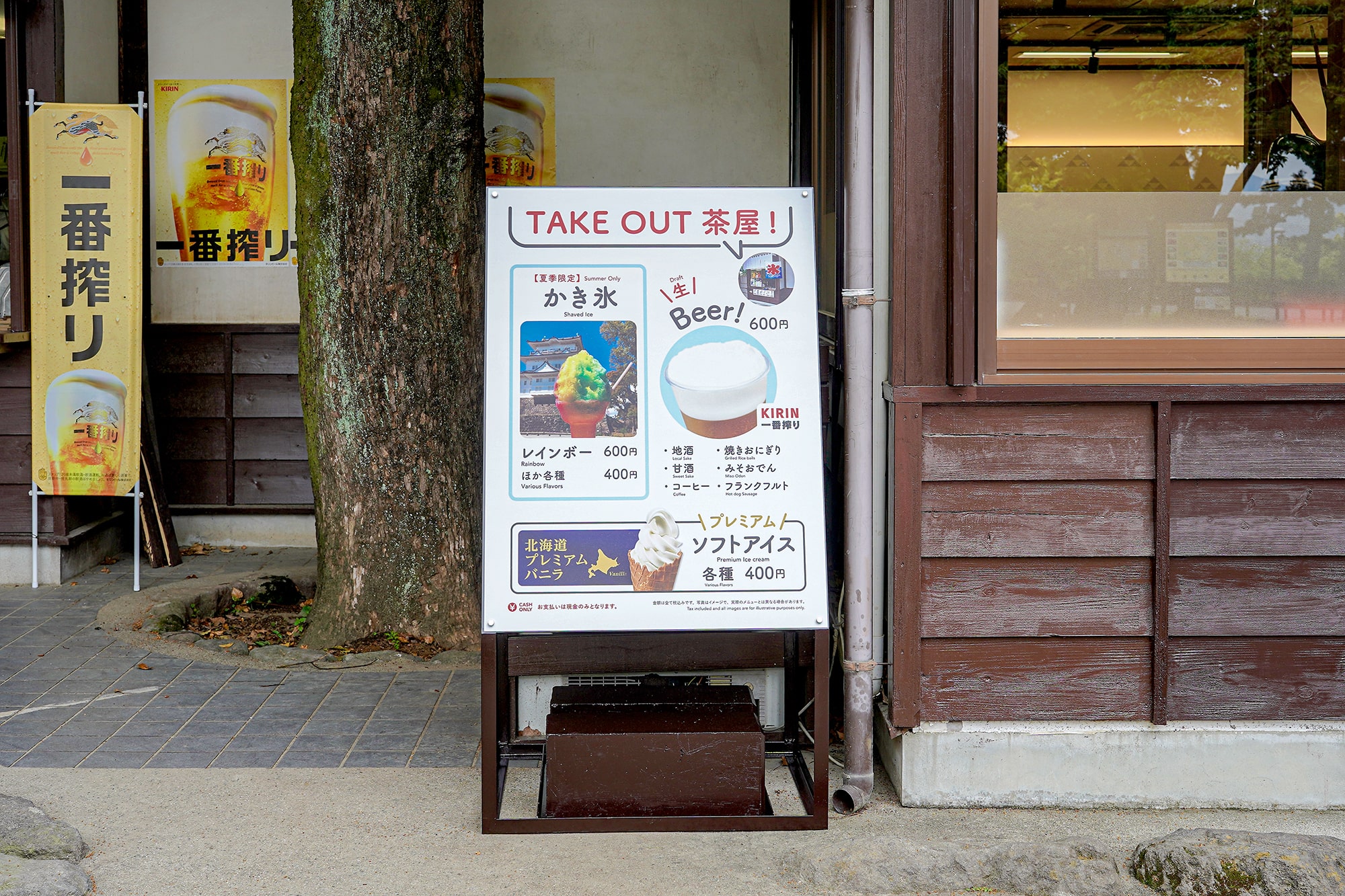 小田原城址内にある食事処、本丸茶屋様のテイクアウトコーナーの窓に設置するメニューの制作を行いました。すでに制作及び施工が完了している店舗の外用メニューのデザインを踏襲しつつ、テイクアウトの気軽さやワクワク感を盛り込めるよう工夫をしました。