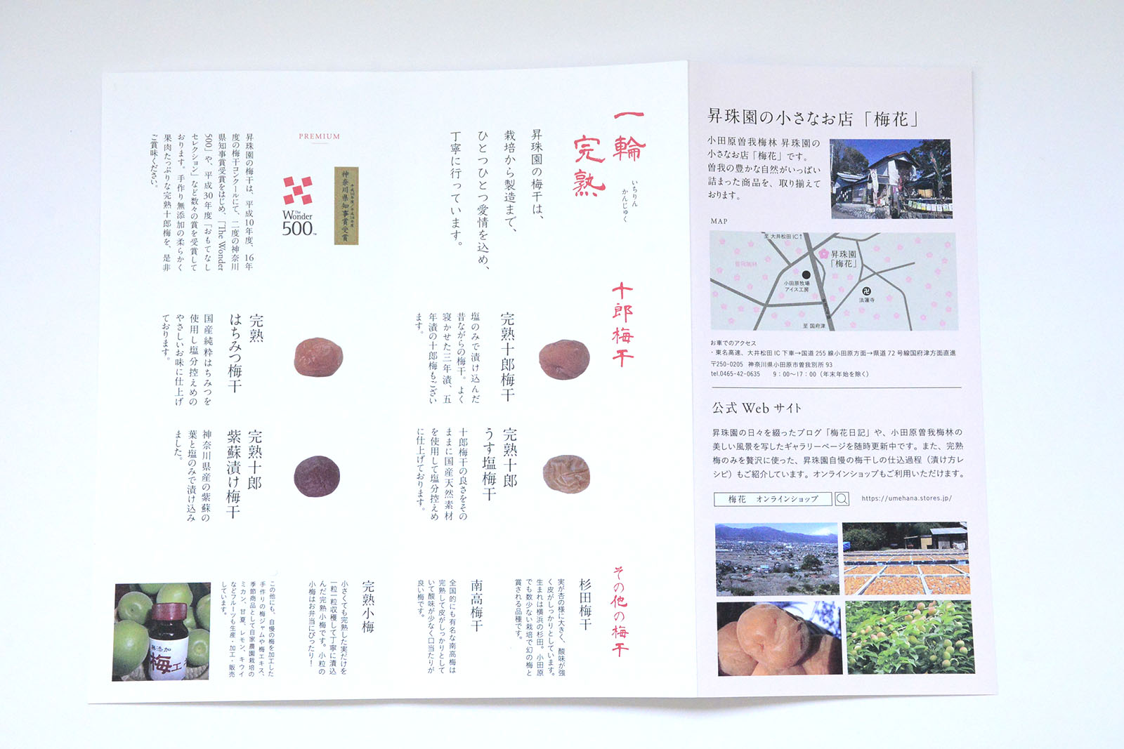以前作らせていただいた、ロゴ、パンフレットとトーン&マナーを揃えました。写真撮影も弊社で行い、梅園の手入れの様子や、梅干しの加工の様子を掲載しました。