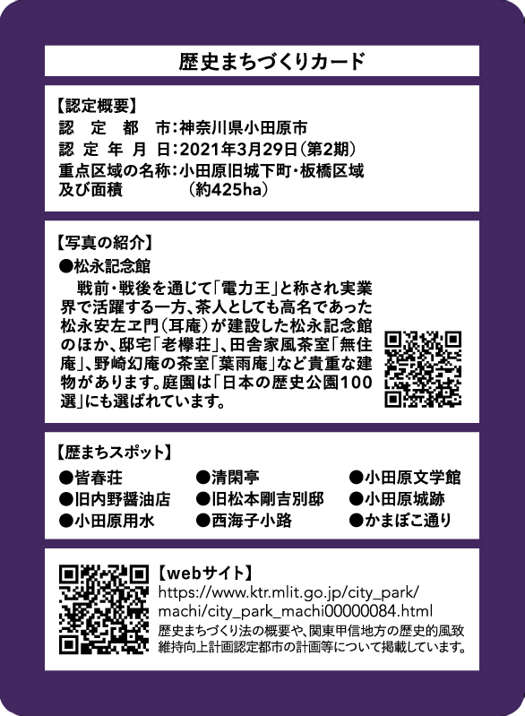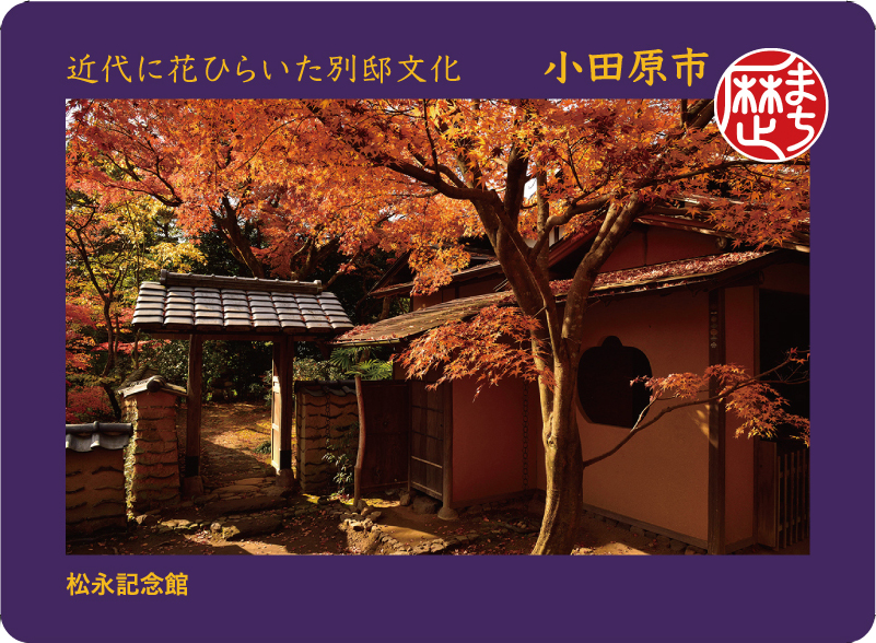 表面に歴史まちづくりに取り組む都市の象徴的な写真、裏面に歴史的資源などの情報を載せた名刺サイズのパンフレットを配布する取組で、小田原市では平成30年度から配布を開始しています。