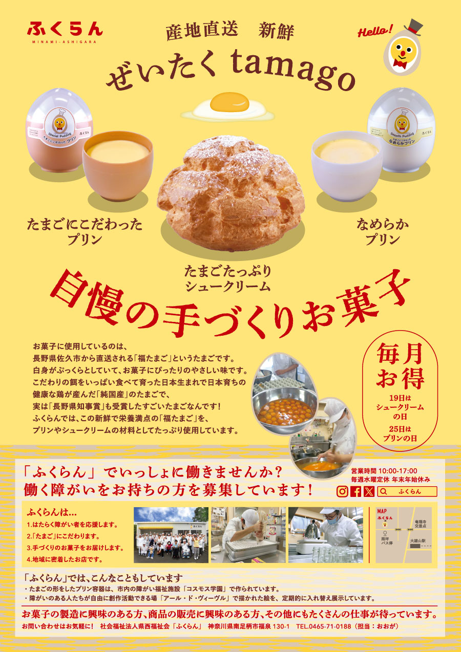 社会福祉法人県西福祉会様が運営する、働く障がい者を応援するこだわりたまごとお菓子のお店「ふくらん」の、周年感謝セールのチラシをデザインし、チラシの近隣へのポスティングも弊社で提案させていただきました。