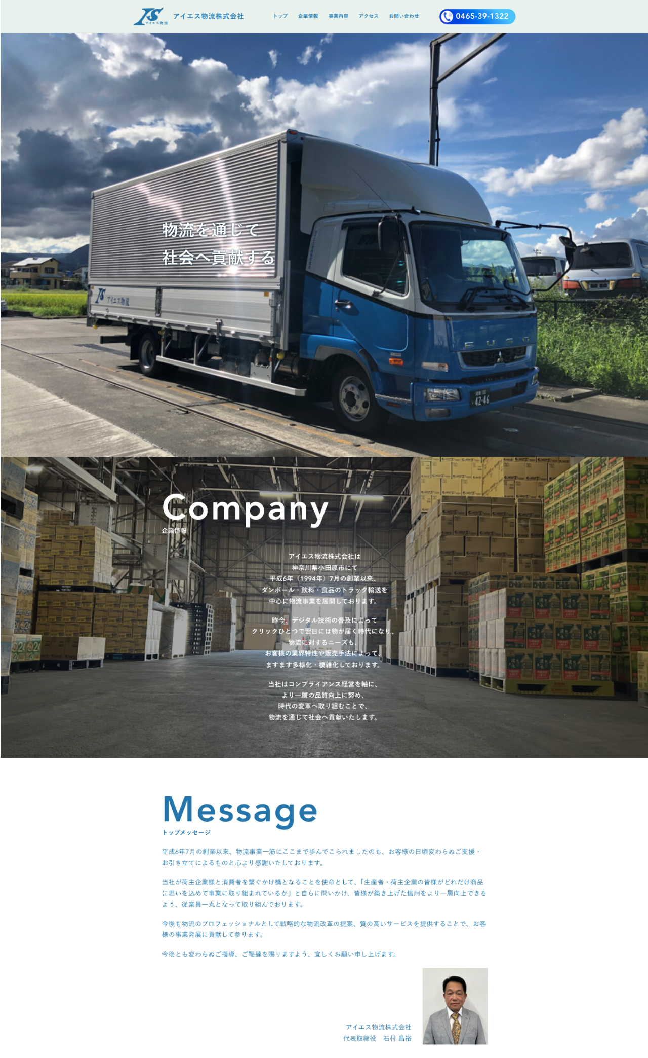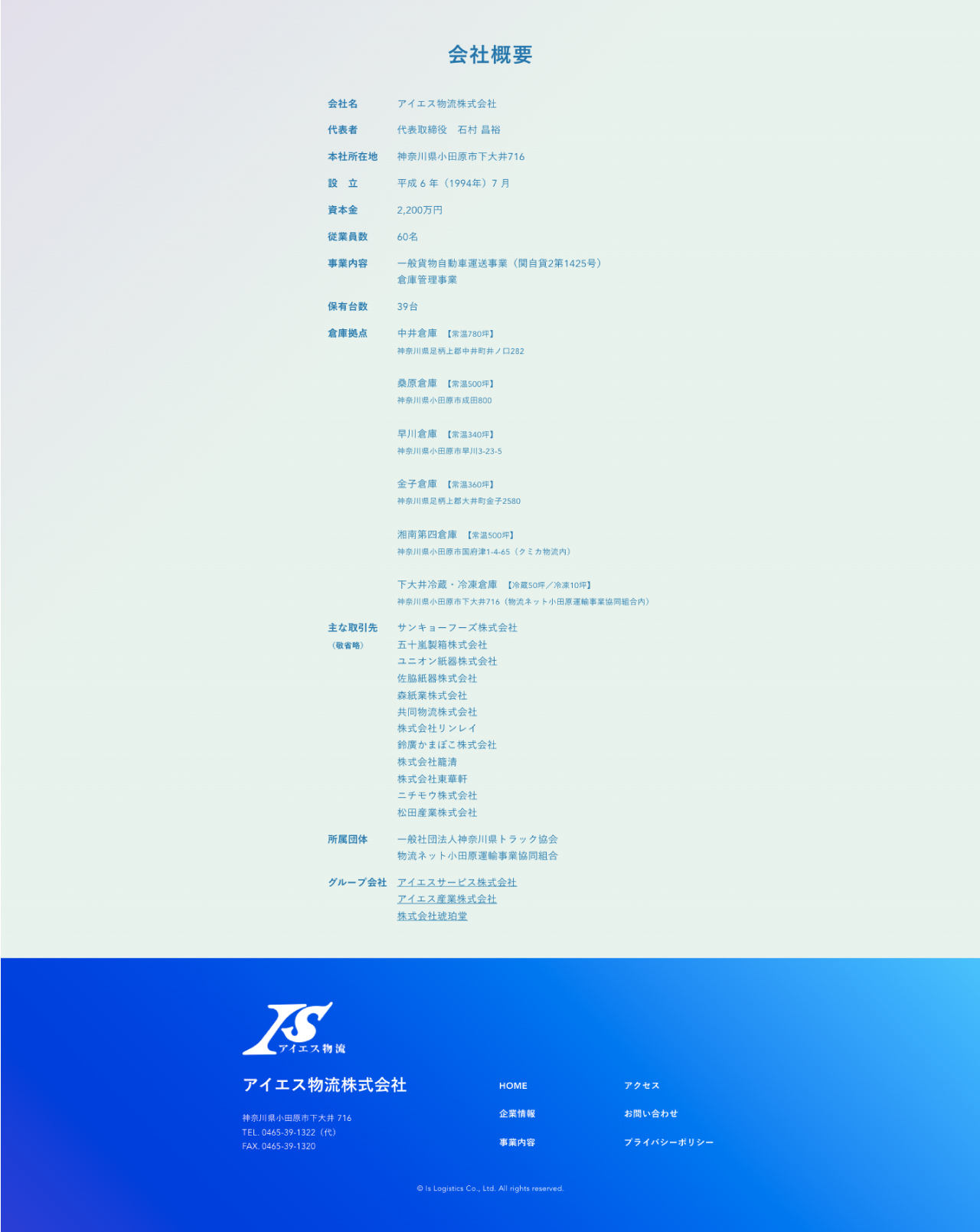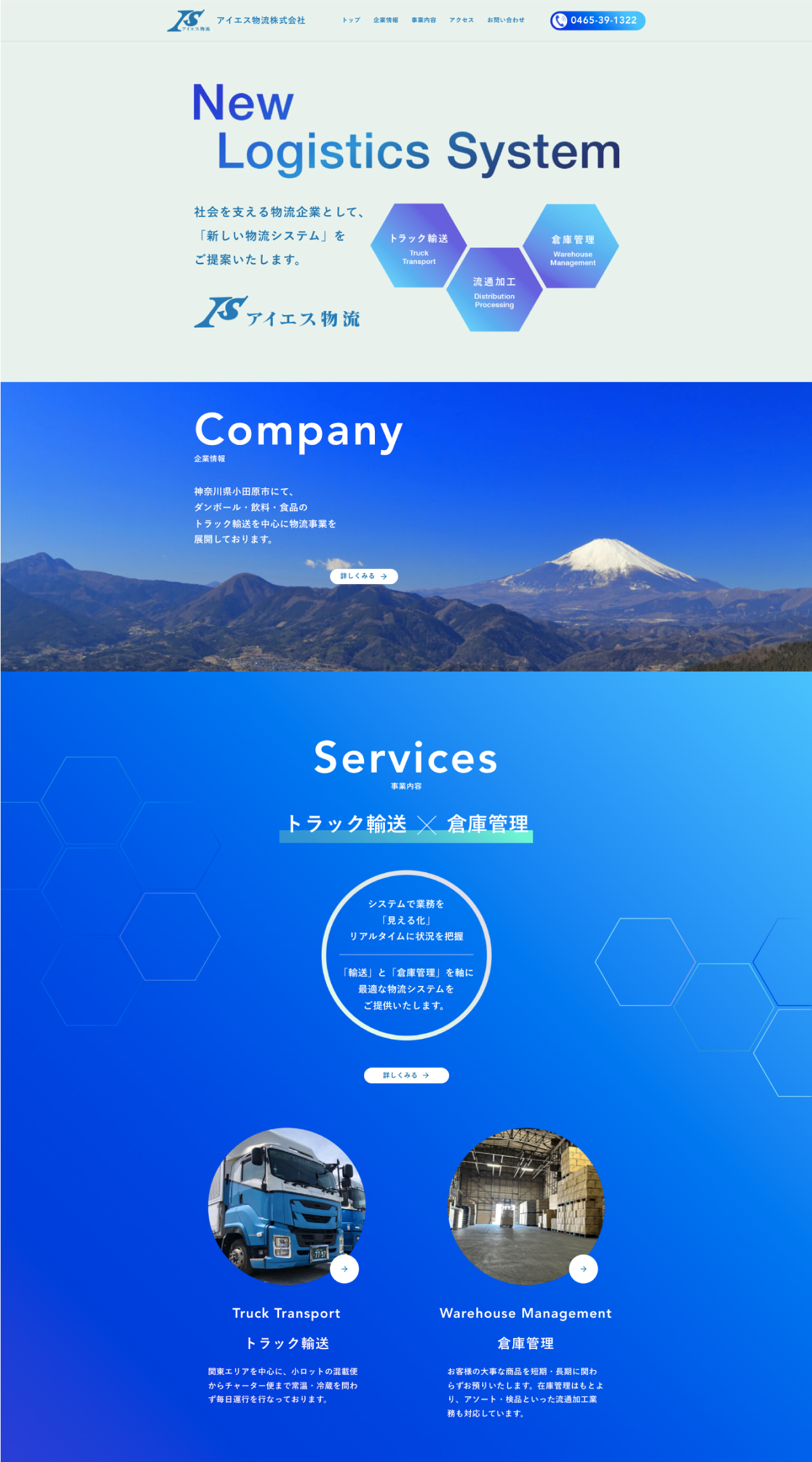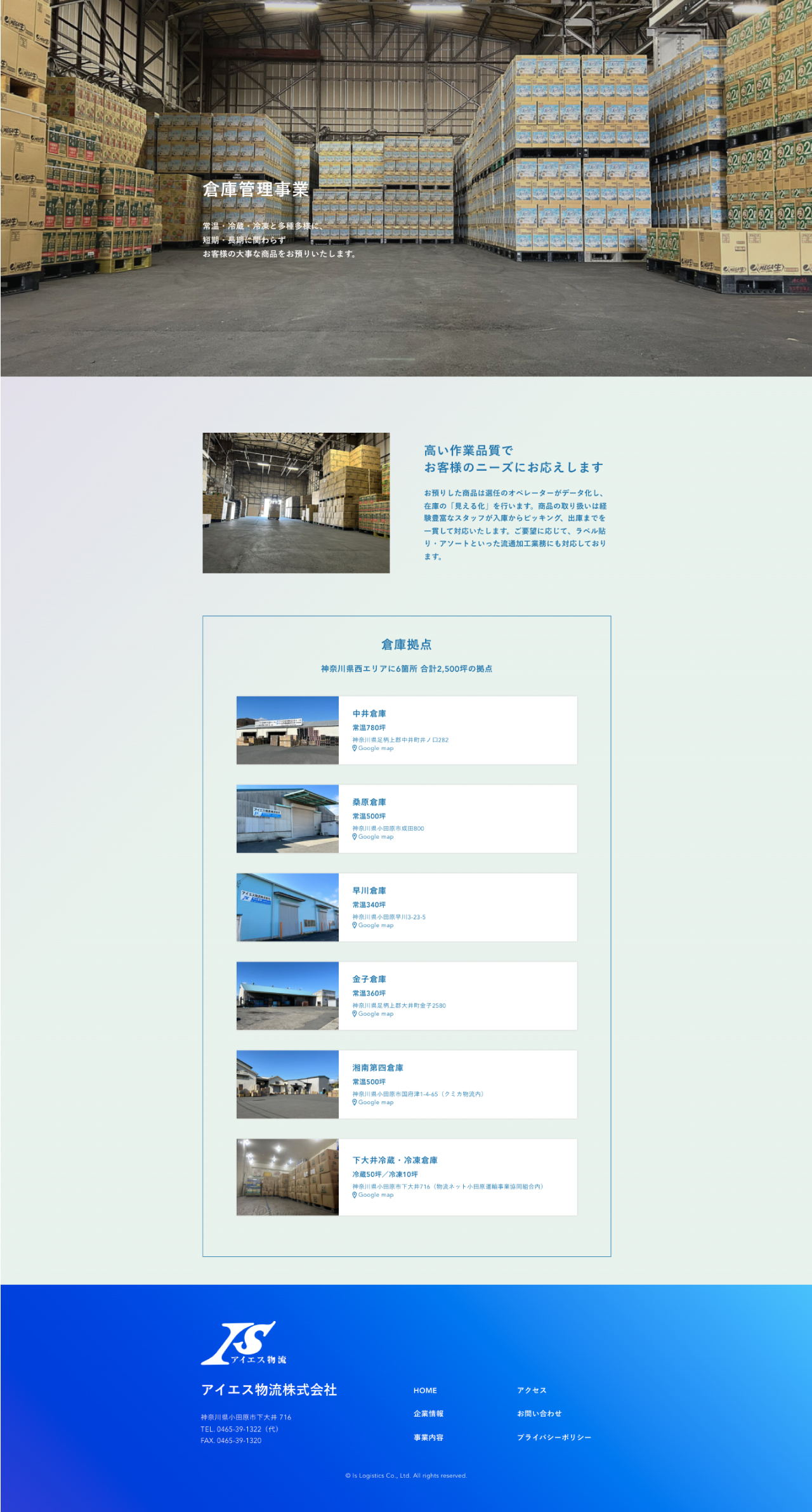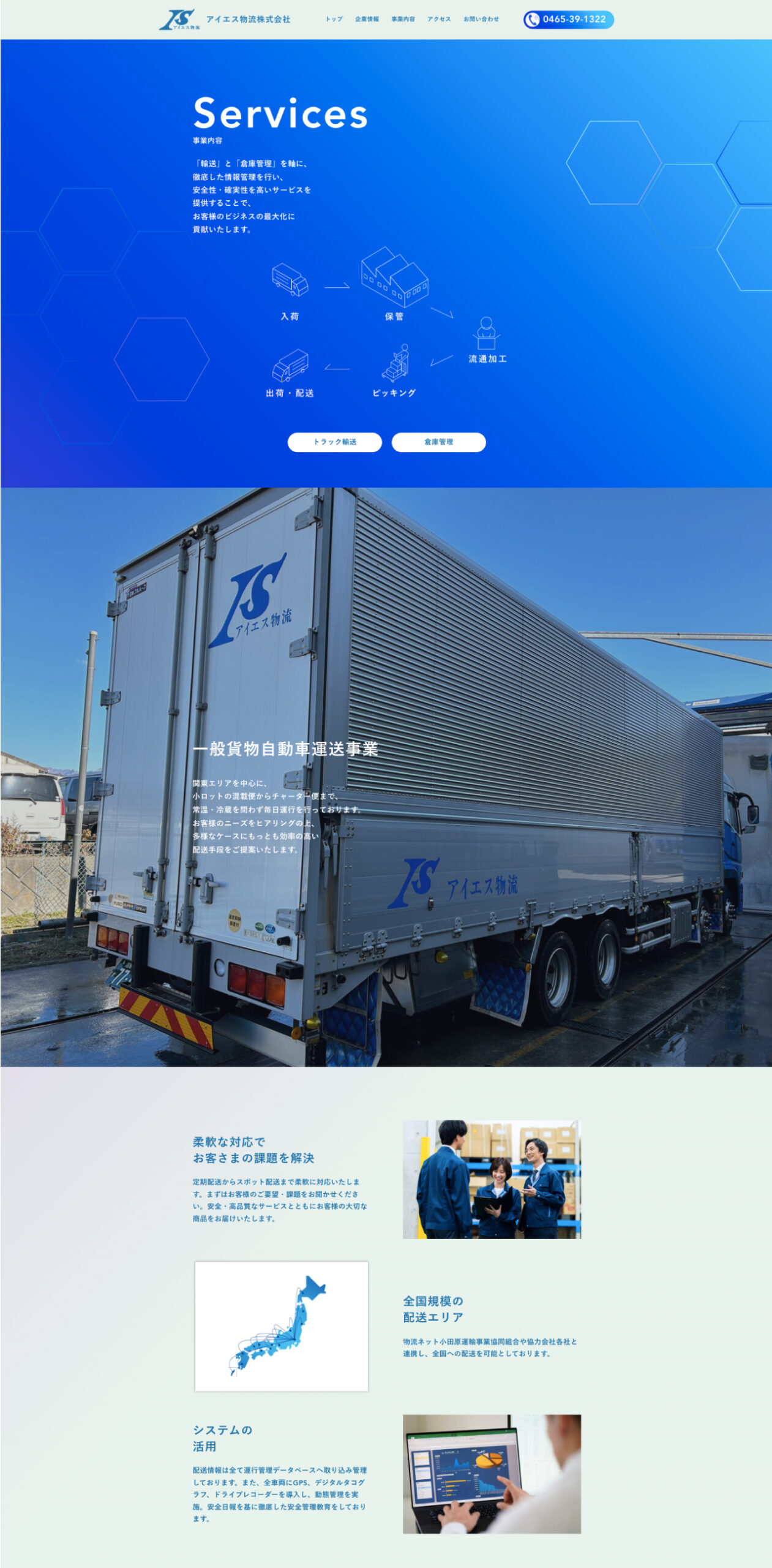 神奈川県小田原市下大井に本社を構え、神奈川県西エリア6箇所に倉庫拠点を展開するアイエス物流株式会社様のコーポレートサイトを制作しました。トップページから直感的に知りたい情報にアクセスできるような、シンプルな設計にしたいと言うご要望にお応えし、必要な情報にスムーズにアクセスできるよう工夫しました。