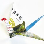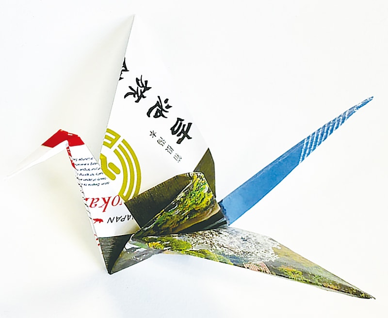 ミシン線で正方形に切り取って日本庭園柄の大きな折り鶴を折ることができます。